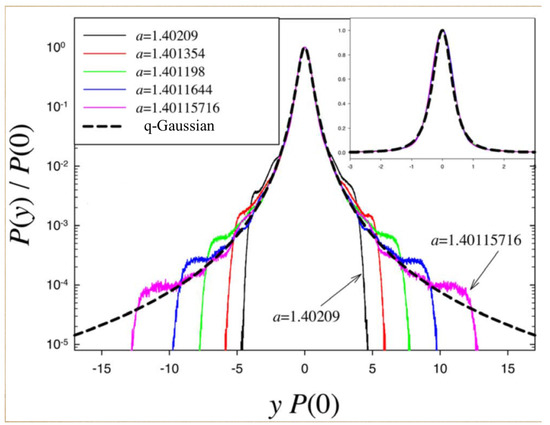 where and are parameters. This distribution recovers the Gaussian case as . Results for the probability distribution of y for the logistic map are given in Figure 3. It is clear that a q-Gaussian behavior gradually develops, with periodic oscillations, as we get closer to the chaos threshold. This is not only correct for the standard period-doubling route to chaos but also for any other periodic cycles available in the chaotic region [37].