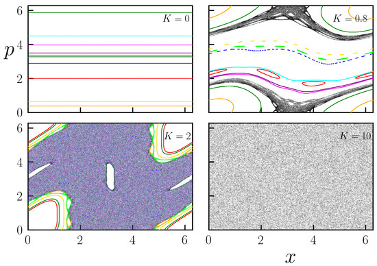 The phase space portrait of the standard map is shown in Figure 4 for four representative values of the map parameter. It is evident that the chaotic sea grows inside the stability islands as the value of K increases.
