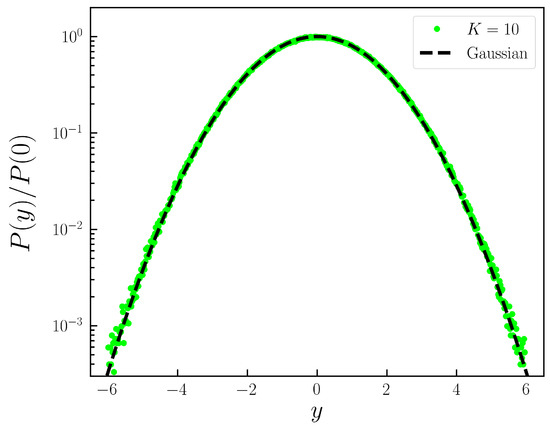 Because the chaotic sea dominates the full phase space for the case, one would expect that, for the probability distribution of the random variable y defined in Equation (20), the usual CLT holds. This is indeed verified in Figure 5. A Gaussian trend is clearly visible, as expected.