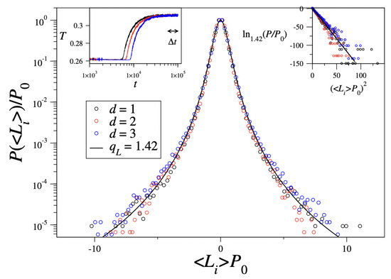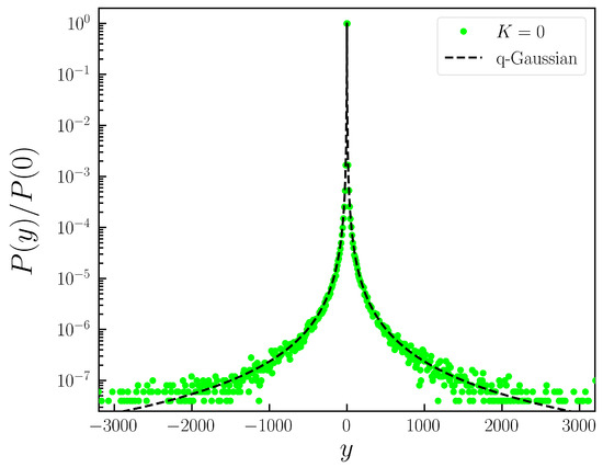Normalized probability distribution functions of the standard map for case. In this simulation, and . The q-Gaussian fit is realized with .