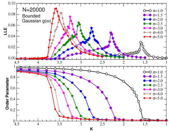 It is interesting to study the shape of the phase transition in the Kuramoto model together with the behavior of the largest Lyapunov exponent (LLE), both as a function of the chosen distribution . Ref. [54] explored what happens by using bounded Gaussian distributions with and a standard deviation going from to , being in this latter case almost uniform (see the original paper for details about the numerical integration and the adopted software). By calculating the order parameter and the LLE as function of K for several values of , one obtains the curves shown in Figure 7 for N = 20,000. In this figure, for increasing values of , a transformation from a continuous second-order phase transition (lower panel, on the right) toward an abrupt first-order-like one (on the left) is clearly visible, together with an analogous change in the peak of the largest Lyapunov exponent (upper panel), whose maximum value is also related with . In correspondence, the critical value , initially depending on , moves from right to left toward a final value which does not depend on any more and is very close to the theoretical value predicted for a true uniform with (which in principle would strictly request ). At the same time, the region of partial synchronization, which is mainly situated after the phase transition for small values of , progressively shifts before the phase transition for increasing values of .