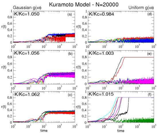 In Figure 8, again for a system of N = 20,000 oscillators, we draw the temporal evolution of the order parameter for several single runs for three values of near the phase transition, for both Gaussian (left column) and uniform (right column) . It clearly appears that in the latter case (panels (e) and (f)) stationary states with high and low asymptotic values of r coexist, whereas in the former case (panels (a), (b), and (c)) only partially synchronized stationary states are visible. Such a result reinforces the distinction between the first-order-like and second-order-like dynamical phase transitions, occurring in the Kuramoto model depending on the different distributions, which seem to play a very crucial role. As already noticed in Ref. [54], in some cases (see for example panels (a) and (f)) metastable states appear for both distributions. As we will see in the next section, this phenomenon can be also recognized in the HMF model, where analogous metastable quasistationary states (QSS) have been observed when the system starts from out-of-equilibrium initial conditions.