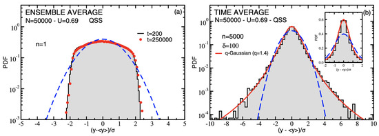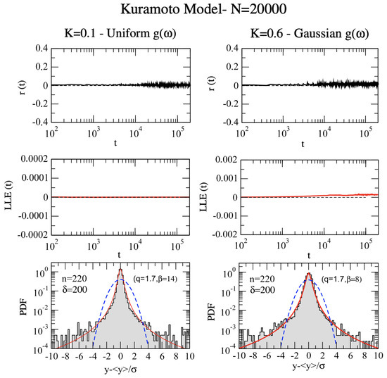 Another interesting feature, common to both Kuramoto and HMF models, is the violation of the standard CLT in conditions of weak chaos (i.e., when LLE ) (see Ref. [60]; see the original paper for details about the numerical integration and the adopted software). In the Kuramoto model, one can use the angles of the N oscillators as stochastic variables and build the corresponding rescaled sums y’s by picking out, for each oscillator, n values of the angle at fixed intervals of time along the deterministic time evolution imposed by Equation (26), i.e.: