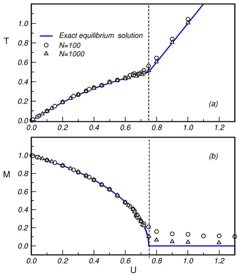 where the mass m is usually set to 1. The potential term of Equation (24) reveals the mean field nature of the model, because each rotor can interact with all the others. Such a nature becomes more evident if we define as order parameter the magnetization , where and are the modulus and the global phase. Within this assumption, the Hamilton equations of motion can be written as