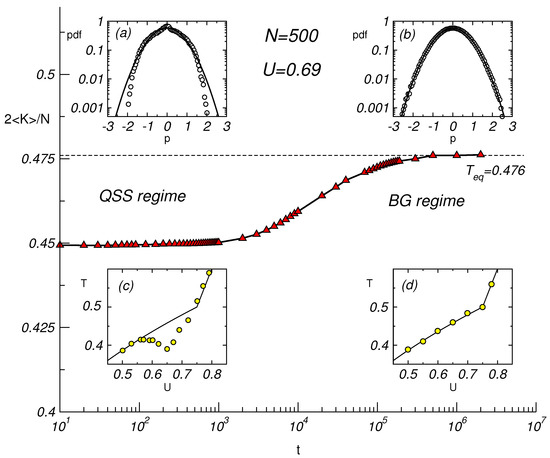 - Pluchino, A.; Latora, V.; Rapisarda, A. Metastable states, anomalous distributions and correlations in the HMF model. Phys. D Nonlinear Phenom. 2004, 193, 315–328. [Google Scholar] [CrossRef]