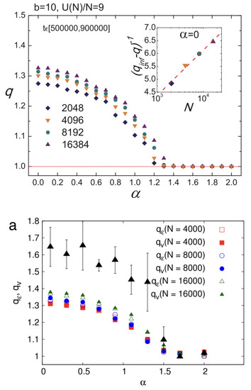 However, at the other end, where the full phase space is dominated by the stability islands (namely, for case), a completely non-Gaussian trend is evident from Figure 6. It was shown in [40] that the probability distribution can be approximated by a q-Gaussian with . Later on, the asymptotic value of q was analytically found to be [41]. Obviously, this value can only be approached numerically as and limits are taken simultaneously.