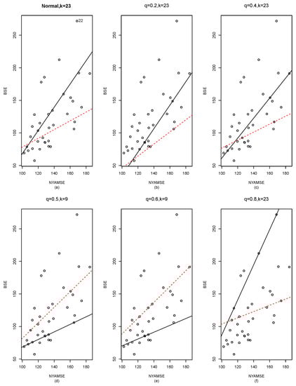 Holbert [43] conducted a Bayesian analysis of a switching linear model and analyzed the Stock Exchange data in America, which includes monthly observations from January 1967 to November 1969. Response variable Y is the monthly dollar volume of sales (in millions) on the Boston Stock Exchange (BSE), and regressor X is the combined New York American Stock Exchange (NYAMSE). The scatter plot shows that a suspicious change-point may exist at some time position, so a regression model with a change-point may be better to fit this data than a simple linear regression model. Chen [1] analyzed this data using the normal change-point model and detected a possible position of change-point, which is with minimal SIC=358.18. Therefore, Chen [1] believed the regression model change starts at the time point 24, December 1968. Osorio and Galea [8] studied this data based on the Student-t model with the SIC technique, finding that for and when the degree of freedom is bigger than 4. Osorio and Galea [8] finally drew the same conclusion as Chen [1] that the regression model change starts at time point 24. Yang [12] detected change-point position 9 based on the Laplace regression model with a minimal SIC=353.83. Carefully examining the scatter plot, it can be seen that point 22 at the top-right is far away from other points, and is much bigger than others; thus, point 22 appears as an outlier. We consider the following robust QR change-point model