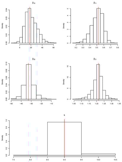 Figure 1 presents the scatter plots and estimated regression lines based on the normal model and QR change-point model with five quantile levels. Figure 1a presents the result by the normal model with detected change-point position 23, clearly point 22 has a high effect on the estimation, for that point 22 increases the slope of the black line by dragging this line towards itself. Figure 1b,c,f show the estimated quantile regression lines with relatively low level , and high level respectively, and the estimated change-points are all 23, but the recognized regression lines can not effectively reflect the whole dependent relationship between BSE and NYAMSE. Figure 1d,e gives the estimated median and level regression lines with change-point 9, which are robust to outlier 22 and reasonable in describing the relationship between the response and regressor. Therefore, we consider time point 9 as the position of the change-point and believe that the regression model change starts at time point 10, which is October of 1967. The median and quantile regression models with change-point 9 are both reasonable. Take for example, in Figure 1e, the estimated regression coefficients (black solid line) are for observations 1–9, and for observations 10–35 (red dashed line). This example illustrates that the quantile regression model with the IBF sampler effectively detects the position of possible change-point. As a by-product, the density histograms of the posterior samples generated by the IBF sampler from the observed posterior distribution of parameters are presented in Figure 2, which shows us how the parameters are distributed given the observed data graphically.
