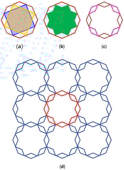 Of late, metamaterials designs have been made possible by drawing inspiration from Islamic geometrical patterns [54,55,56,57,58,59,60]. A metamaterial that exhibits tunable positive and negative hygrothermal expansion is considered herein by inspiration from an Islamic geometrical pattern furnished in Figure 1, constructed by interlacing a regular octagon with four neighboring octagons along the on-axes directions and four smaller octagons in the diagonal directions. Such interlace produces a repetitive unit that exhibits a circumference of eight rhombi where the inner outline reveals an eight-pointed star, while reference to the smaller octagon shows a circumference of four rhombi in which a four-pointed star can be observed at its inner outline. The circumference of eight rhombi—exhibiting outer and inner outlines of an octagon and an eight-pointed star, respectively—is a relatively common Islamic geometrical pattern, and one that manifests a high degree of symmetry.