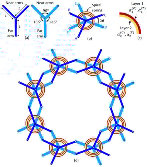 (a) Two Y-elements with their geometrical descriptions, (b) a pair of Y-elements connected at their junctions and elastically restrained by bimaterial spiral spring, showing their angular offset , (c) layers 1 and 2 of the bimaterial spring with contrasting CTEs and CMEs and (d) an assembly of eight pairs of Y-elements to form an isolated unit cell that resembles the four-fold symmetrical Islamic geometrical pattern furnished in Figure 1.