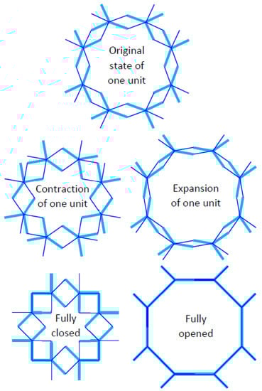 The original state of a unit cell (top) undergoing contraction (left) and expansion (right) until the attainment of fully closed and fully opened configurations, respectively (bottom).