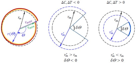 where is the angle swept from the inner end () to the outer end () of the spiral spring. The use of the mean spiral spring radius is valid when the difference between the maximum and minimum radii is small in comparison to the mean radius, , as stated earlier in assumption (b). Consider a spiral spring of number of coils, i.e., as shown in Figure 5 (left) for the sake of simplicity, as it will later be shown that the coil number is never an integer except when . Suppose there is a change in environmental temperature and/or moisture concentration such that the mean curvature of the spiral spring changes. If the mean curvature decreases, i.e., the mean radius of curvature increases as shown in Figure 5 (middle), then a gap of is generated. If, on the other hand, the mean curvature increases, i.e., the mean radius of curvature decreases as indicated in Figure 5 (right), then an overlap of is produced. To prevent ambiguity, the resulting angular gap and angular overlap are assigned negative and positive values, respectively. If, instead of a single coil, the number of coils is generalized as , then the total angular gap or angular overlap is correspondingly . Invoking the conservation of arc length, as indicated in assumption (d), the arc length based on the original mean radius of curvature is equated to the arc length for the updated mean radius of curvature to yield