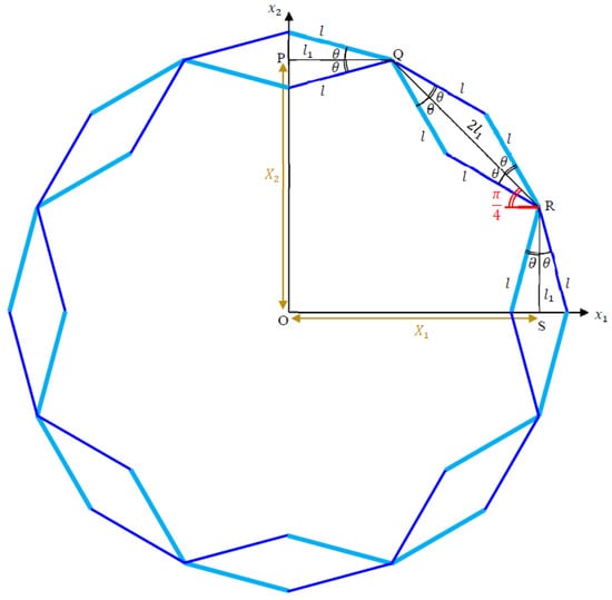 Figure 7 displays the metamaterial’s unit cell, with all the unnecessary lines removed for the sake of clarity, for establishing the infinitesimal models. The lines of length in Figure 7 correspond to those indicated in Figure 2a. In Figure 7, the lines in contact with the axes correspond to the far arms while those not in contact with the axes commensurate with the near arms, as compared with Figure 2d. The points Q and R refer to freely rotating pin joints.