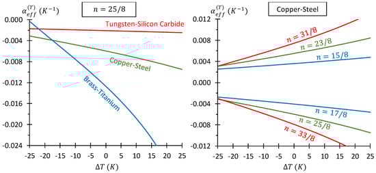 Plots of effective CTE versus temperature change for the tungsten-silicon carbide, copper-steel and brass-titanium bimaterial spiral spring at (left), and for (which gives two sets of coil number ) using copper-steel bimaterial spiral spring (right).