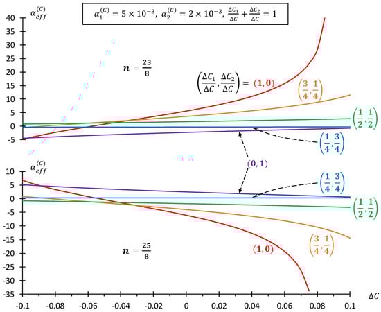 Comparison between models of the effective CTE with the effective CMEs indicates the obvious analogies between the bimaterial layers’ individual CTEs with the bimaterial layers’ individual CMEs , as well as the analogy between the environment’s temperature change and the environment’s moisture concertation change . In addition, influence from geometrical properties on the effective CTE is identical to the effective CME. As such, CMEs of the bimaterial layers and the coil number on the effective CME can be inferred from its thermal counterpart. Instead, an observation is made on the effect of the moisture concentration changes in the bimaterial layers relative to the environment’s moisture-concentration change . Due to the non-absorptivity of moisture in metallic solids, polymeric bimaterial spiral springs were selected for calculating the effective CMEs. Since the range of CME of typical polymers is typically [75,76,77,78], CMEs of and were selected. It should now be pointed out that if the absorptivity of both layers of the bimaterial spring are equal, leading to , then the effect of CME contrast on is comparable to the effect of CTE contrast on . To observe only the effect of absorptivity, the present scope is limited to the case where so as to simplify Equations (23) and (29) to