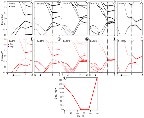 The bulk gap dependence on Sn concentration calculated by the supercell method is shown in Figure 2k where a behaviour similar to the KKR method results is evident (see Figure 1). A gradual decrease of the value of the bulk gap at in the range is followed by a zero-gap plateau for . The bulk gap then increases again during the transition to the SnBiTe stoichiometry. When the concentration of Sn atoms reaches 50%, the energy gap closes at the point but remains finite at the Z point. However, when the Sn concentration reaches 75%, the energy gap at the Z point closes but opens at the point instead. The full substitution of Mn with Sn is characterized by finite bulk gaps at both (normal gap) and Z (inverted gap) points. It is indeed typical for SnBiTe or PbBiTe compounds which are TI as well [27,29,30,33].