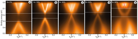 In the case of slab DFT calculations, one can observe additional Sn-derived states that are absent in the bulk crystal calculations in Figure 2. They appear as additional dispersion branches in both bulk valence and conduction band regions entering the bulk gap when Sn concentration is 50% (they are more pronounced for greater concentrations). A further increase in Sn concentration leads to a deformation of the energy dispersion of these additional Sn-derived states. In the case of , one may observe a structure that resembles two -shifted parabolic branches (these states are marked by dashed red lines in Figure 4d) with an avoided crossing feature at the point. The formation of similar additional states is also visible in the experimental ARPES data in Figure 3.