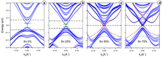 Calculated electronic structure of the TSSs and the nearest valence and conduction band states for different Sn concentrations: 0% (a), 25% (b), 50% (c), 75% (d). The positions of the edges of the bulk band gap are marked with horizontal dotted lines, and the energy gap in the TSS (where they are present) is marked with green solid lines indicating its magnitude. Sn–derived states in panels (c,d) are marked by red dotted lines.