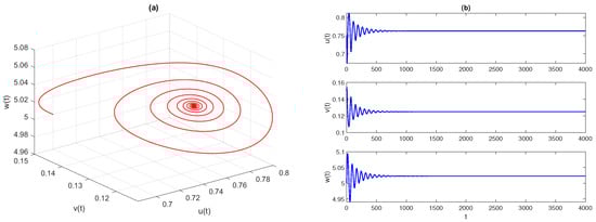 The eigenvalues of the Jacobian matrix J evaluated at are and . Clearly, 1 is always positive, and and are always negative. Therefore, the species-free equilibrium is unstable. This result biologically implies long-term surveillance. It means that none of the species will become extinct at the same time. □