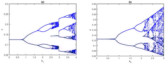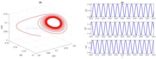Equation (5) represents a single-species growth model (a logistic model). The discrete version of model (5) tends to be the logistic map, which exhibits a variety of complex behaviors, including unstable, stable, period-doubling, and chaotic oscillations. Chaotic dynamics can be seen in discrete-time models with only one species, but at least three species are needed for continuous-time systems. There has been a lot of research on the dynamical properties, including stability and bifurcation, of both continuous-time models [13,31,43] and discrete-time models [5,6] in independent ways.