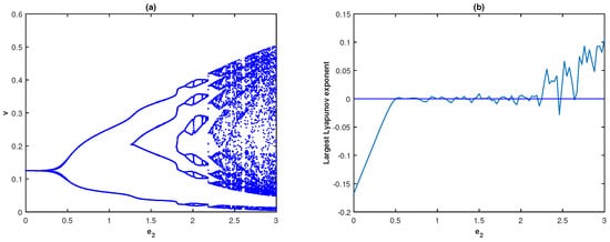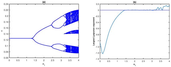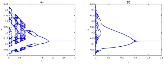 Next, we explore how fear-induced COE parameters are reflected in the system dynamics. First, we analyze the impact of the middle predator induced fear on the prey’s growth and its COE, while the fear of the special predator on the middle predator is absent . The bifurcation diagram and fluctuations of LLE of system (4) with respect to when are, respectively, presented in Figure 6a,b. It can be seen in Figure 6a that the system remains stable for the lower values of , then the system turns chaotic through period-doubling as increases. Figure 6a illustrates that the system dynamics demonstrate stable behavior for ; limit cycle oscillations for , and display higher periodic or chaotic oscillations for In addition, we observe that the system remains chaotic for larger values of To verify the chaotic behavior of system (4), we draw the fluctuation of the LLE with respect to in Figure 6b. For different values of , the phase space diagrams of model (4) are given in Figure 7, where the system is LAS for , periodic oscillation for , and chaotic oscillation for In Figure 8, we draw a two-parameter bifurcation diagram between fear and its COE parameter . For smaller values of , we observe that the system changes its state from chaotic oscillation to a stable one through period-halving with increasing, while for higher values, the system remains chaotic. The chaotic phenomena can also be controlled by increasing fear parameter . Similarly, we analyze the impact of the special predator-induced fear on the middle predator’s growth and its COE, while the fear of the middle predator on the prey is absent . In this case, Figure 9 displays the bifurcation diagram and LLE of system (4) with respect to when We should note that the system becomes chaotic from stable oscillation through period-doubling as COE parameter increases from 0 to 3. The phase space diagrams of model (4) are drawn in Figure 10 for different values of , where the system is LAS for , the periodic oscillation is for , and the chaotic oscillation is for Moreover, we notice that as further increases, the system enters into periodic oscillation from chaotic oscillation.