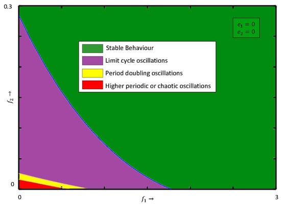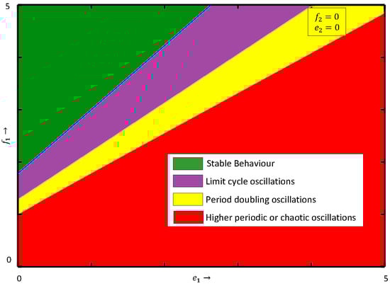 The two-parameter bifurcation diagram for model (4) in the parametric plane; where the system displays stable behavior in the green region, limit cycle oscillations are in the purple region, period-doubling oscillations are in the yellow region, and chaotic oscillations are in the red region. The rest of the system parameters are the same as in Equation (29) except .