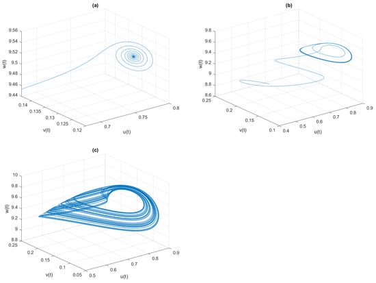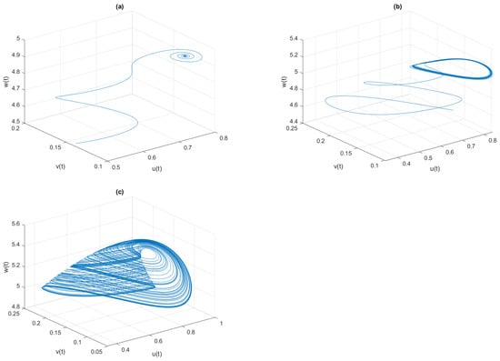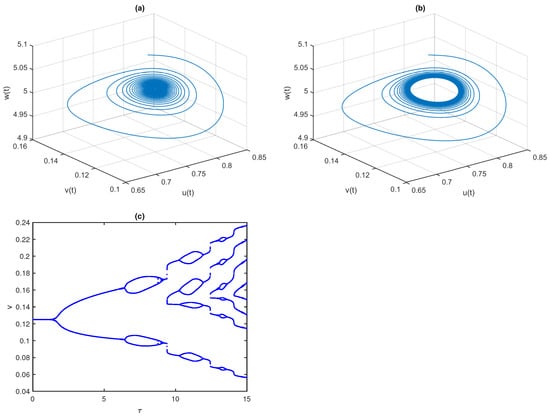 Note that when the system loses its stability around , and the Hopf bifurcation occurs.
