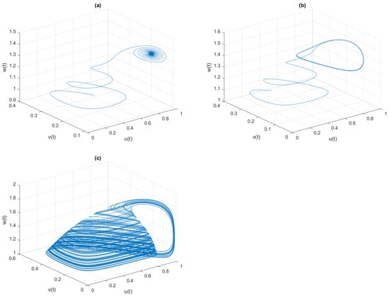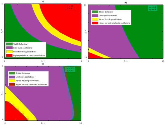 The two-parameter bifurcation diagram for model (4): (a) parametric plane; (b,c) parametric plane; where the system displays stable behavior in the green region, limits cycle oscillations in the purple region, with period-doubling oscillations in the yellow region and chaotic oscillations in the red region. The rest of the system parameters are the same as in Equation (29) except in (a) (b) (c) .