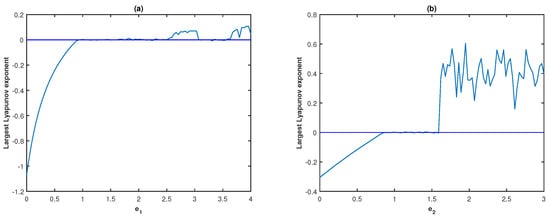 Next, we examine how the system dynamics are influenced when both fear-induced COE factors are present. To emphasize this, we draw the two-parameter bifurcation diagram in the parametric plane of system (4) in the presence of the fear-induced COE in the prey species as well as in the middle predator, see Figure 11a. We observe that for lower values of COE parameters, and , system (4) shows stable behavior and it becomes chaotic through period-doubling as () increases, i.e., both and have destabilizing effects for fixed fear parameters . Figure 11b,c display the two-parameter bifurcation diagram in the parametric plane of system (4) with and , respectively. The figure clearly shows that as or increases, the stability region in the parametric plane gradually decreases. To protect biodiversity, artificially introduced fear through vocalization plays a crucial role. In reality, species learn about the introduced artificial fear from past experiences and pass it on to future generations as fear-induced COE parameters increase, and as a result, a greater amount of prey and middle predators are consumed by middle and special predators, respectively, in the ecosystem. This situation leads a species population to an extinction stage. It is clear that the system exhibits chaos for higher values of , and it can be controlled by increasing the fear parameter. For a better understanding of the impacts of and on the dynamics of system (4), we plot the bifurcation diagram with respect to and in Figure 12. It can be observed from Figure 12 that an increase in parameter () makes the system chaotic from stable through period-doubling. If we observe that the system exhibits stable behavior for , limits cycle oscillations for , and higher periodic or chaotic oscillations for Similarly, if we observe that the system exhibits stable behavior for , limits cycle oscillations for , and higher periodic or chaotic oscillations for The chaotic behaviors occurring in Figure 12 can be confirmed by the positive LLE values shown in Figure 13. To show the impacts of parameters and on the system dynamics, we draw the phase space diagrams of model (4) for different values of in Figure 14. The values of LLE presented in Figure 6b, Figure 9b and Figure 13 are summarized in Table 1, where the positive values confirm the chaotic dynamics of model (4).