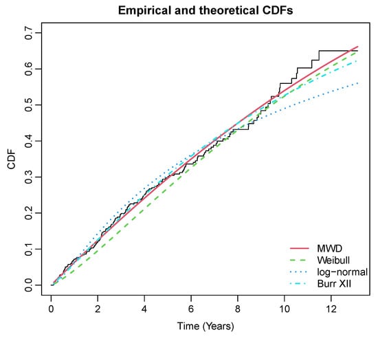 Lai et al. [24] developed the MWD and discussed some of its theoretical properties, for example, the bathtub behaviour of the hazard rate. Ng [28] estimated the parameters of the MWD for progressive type-II censored samples. Furthermore, some Bayesian estimations of MWD parameters were considered in [29,30]. The MWD is assumed here as a baseline model of the cause-specific AH analysis in (1), due to its flexibility to accommodate various shapes of the hazard function.