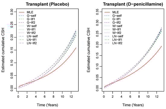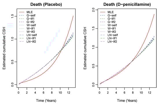 To transform survival time in terms of years, we divided it by 365, which yielded a median survival time 4.74 years. We also assumed that 106 patients who did not participate in the trial received the D-penicillamine treatment. Furthermore, we applied the proposed estimation methods to obtain the estimates of the unknown parameters and cumulative CSH functions. To choose unknown parameters for priors, we first tried several parameters and then chose the best one in terms of the convergence performance and computing time. Based on the results of this preliminary analysis, we decided to use the following parameters: (gamma prior); (Weibull prior); (log-normal prior); and (uniform prior). The results of the estimates of the unknown parameters are presented in Table 4. We estimated the cumulative CSH functions using (5) based on the proposed estimators which are presented in Figure 2 and Figure 3.