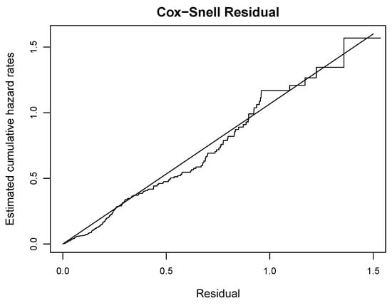Plot of the Cox–Snell residual versus its estimates of cumulative hazard rate.