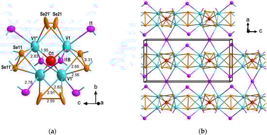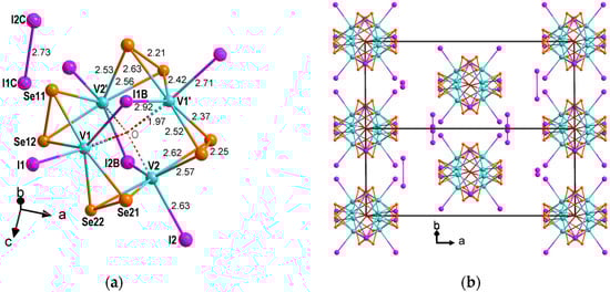 (a) Molecular and (b) crystal structure of [V4O(µ-Se2)2(µ2+2-Se2/2)4(µ1+1-I)4/2(µ2+2-I)2/2]2d, L. Atomic displacements are shown at 50% probability.