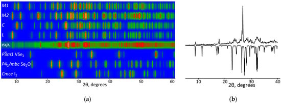 (a) Heat map representation (intensities coded via blue-green-red-yellow-purple color palette) of the experimental X-ray powder diffraction pattern of the crystalline precipitate and computed ones for reagents and known products (M1 is for the structure of [V4O(µ−Se2)4I4(µ-I)2]0d [I2]; M2, L and C are for the structures of this work). (b) Comparison of the experimental diffraction pattern of the crystalline precipitate (top) and simulated one for M2 (bottom).