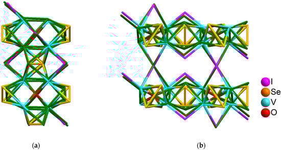 Having obtained a small series of selenium-iodide vanadium complexes, we noticed that heating of similar ratios of starting species (most often metal vanadium, selenium, iodine and water as an oxygen source) at a temperature of 220 °C results in the formation of various molecular compounds containing an O-centered tetra-nuclear fragment V4OSe8I6 [33,34]. In their crystal structures molecules V4OSe8I6 form non-covalent contacts with iodine or 3,5-dimethylpyrazole molecules. When the synthesis temperature was increased to 280–300 °C, we obtained crystals in which tetranuclear complexes V4OSe8I5 form polymeric chains, organized by bridging via iodide ligands.