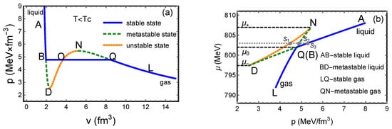 On this curve, the segment DON represents an instable state where the condition of stable equilibrium is violated. An orange dotted line is used to denote unstable states in Figure 1a. The conditions of phase equilibrium require that a horizontal line BOQ is constructed to replace the spinodal curve in order to maintain equal T, p and in the two phases (also known as Maxwell’s construction). An equilibrium phase transition between the gas and the liquid takes place along the straight line BOQ rather than the spinodal curve. The systems on segments AB, BOQ and QL correspond to a pure liquid, gas–liquid coexistence and a pure gas, which are all stable states, denoted by blue lines in Figure 1a. The condition of stable equilibrium does not exclude segments BD and NQ. The systems on the two segments are possible to appear but will rapidly evolve to some corresponding states on line BOQ in case of disturbance. That is why they are called metastable states. The metastable states, plotted as green dashed lines in Figure 1a, were confirmed by experiments and named super-heated liquid and super-cooled gas [], respectively.