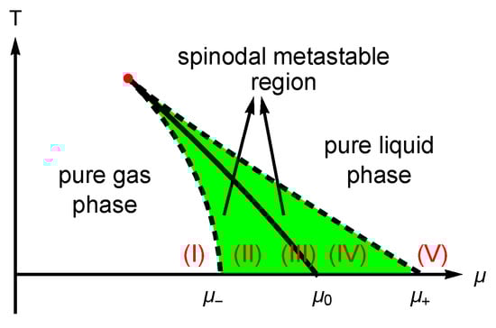 , denoted by the solid line in Figure 2, is just the well-known gas–liquid coexistence line, which forms the boundary of gas phase and liquid phase, in the sense of the thermodynamic limit. In Figure 2, the red point denotes the critical point. The region between and is colored in green, demonstrating the spinodal metastable region where both the stable states and the metastable states are possible states. Thus, the phase diagram is divided into five regions, which are marked by Roman numerals I-V in Figure 2. Region I () describes a pure gas; Region II () describes the spinodal region of a stable gas (corresponding to segment LQ in Figure 1b) and a metastable liquid (corresponding to segment BD in Figure 1b); Region III () describes the coexistence of the gas and the liquid; Region IV () describes the spinodal region of a metastable gas (see segment QN) and a stable liquid (see segment AB); Region V () describes a pure liquid. Both Region II and Region IV are spinodal metastable regions.