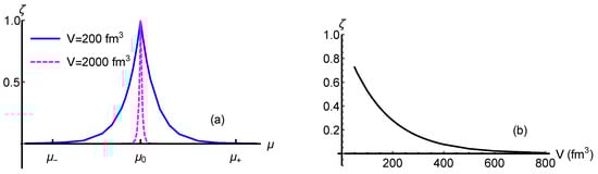 The chemical potential dependence of at a fixed volume, e.g., fm, is shown as the blue curve in Figure 4a. equals to 1 at and gradually decreases to 0 at both sides. The non-zero relative probability illustrates the contribution of metastable states at a finite volume.