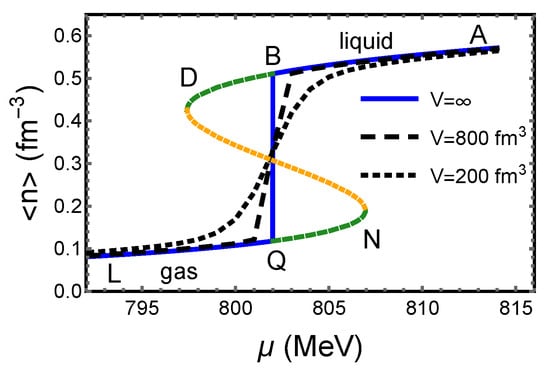 Because is volume-dependent, the average number density is also volume-dependent and can be labeled by a subscript V. Due to , the contribution of the metastable liquid results in for . That explains that the black curves representing two finite volumes are above the blue curve at the left of the discontinuity point. In particular, due to (see the left half of Figure 4a), there is for . That is the reason why the dotted line (for 200 fm) is higher than the dashed line (for 800 fm) at the left neighborhood of the discontinuity. Therefore, the volume ordering of the number density at finite volumes reflects the contributions of the metastable states. The smaller the volume, the larger the relative probability of the metastable state, and the smoother and flatter the curve of the number density.
