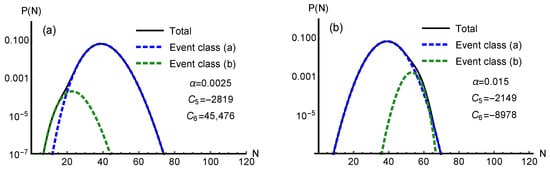 Even though the weight factor is small ( 0.0025 and 0.015 in Figure 6a,b, respectively), the small component can not be ignored. Without the contribution of the small component, the four factorial cumulants can not be well reproduced. Particularly, the small component has a vital effect on higher cumulants, such as . As the legends show, = 45,476 and in Figure 6a,b, respectively. That means, even though the first four factorial cumulants are equal by magnitude for both cases, the fifth factorial cumulant differs by and the sixth factorial cumulant differs significantly (by 5 times in magnitude as well as a different sign).