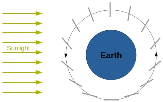 - Decrease the spacecraft orbital energy, where the resulting SRP force is directed in the opposite direction of the spacecraft geocentric velocity (as illustrated in Figure 2).