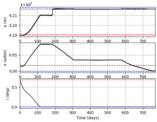 The progress of the values of the spacecraft geocentric orbital elements over time are displayed by the black full lines in Figure 4. The red dashed lines indicate their initial values and the blue dashed lines their given final values.