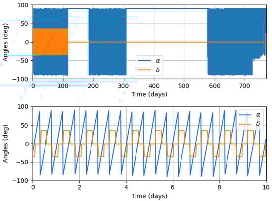 The long idle periods of the solar sail, with no exposed surface area to the sunlight () and, consequently, a null SRP force, can be verified by this plot. Due to the long transfer time, it can be difficult to observe the behavior of and in greater detail. The variation of their values through the course of a day appears as a blur when represented throughout the entire time frame of the maneuver. Therefore, a second plot is displayed for a shorter period of 10 days (zoom in on the X-axis).