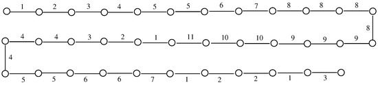 The path of order 35 and size 34 has an irregular decomposition index of 11, as does the cycle . No path or cycle of smaller order has an irregular decomposition index of 11. The eleven subgraphs in the decomposition of are , , , , , , , , , , and . An irregular decomposition of , where for , can be obtained from the decomposition of by identifying the two end-vertices of in Figure 2.
