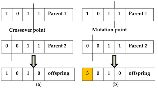 Stage 3: In every recurrence, two trees are chosen as better parents for producing the offspring by genetic operations, such as crossover and mutation. Technically, the crossover randomly determines the crossover point in every parent tree. Offspring trees were generated by splicing together at the crossover point, whereas mutation with the same process deputize a new randomly formed subtree which modifies the GP tree. The pictorial representations of crossover and mutation are depicted in the following Figure 6a,b.