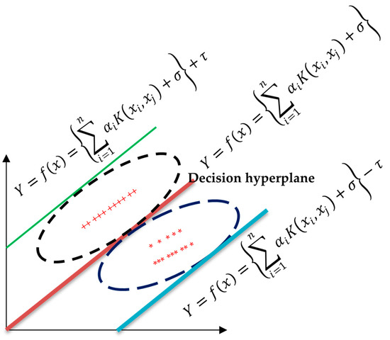 The regression surface, which is the area in between the lower and the upper limit of probability, determines the space for misclassifying a point without making distributional assumptions by the model [84]. The training dataset was classified into 2 random categories, U and V, assuming that U is formed from the limited dispensation with the means and and covariance matrices and . They can be defined as and . The main objectives of MPMR are to determine the approximation function and to predict the limits on the minimum probability [29,30]. The MPMR is based on kernel function. Hence, the can also be fabricated by representing the input data to a greater dimensional space by the following Equations (2a) and (2b):