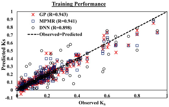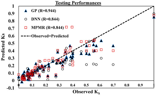 The potency of the MPMR model relies upon two tuning parameters, σ and ε, and the values 0.8 and 0.005 have been determined by random approach. At these values, the MPMR model delivered the best outcome, which was encouraging. The DNN model exhibits the better performance with 5 hidden layers and 20 hidden neurons at 1000 iterations, whereby the value of R = 0.898 for training and R = 0.844 for the testing dataset. The following Figure 10 and Figure 11 depict the training and testing performance of the developed GP, MPMR and DNN models.