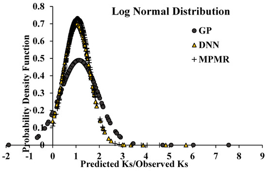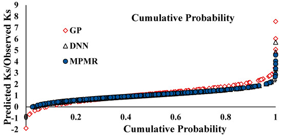 Table 7 conveys that the GP model secured more points than the other MPMR and DNN models. Thus, GP outperforms the other models. The cumulative and log normal distributions of the different models have been plotted between the ratios of predicted to the measured values and the cumulative and log normal distributions [89]. The following Figure 12 and Figure 13 depict that most of the values are in the range of 1, which expose the potential of the developed models.