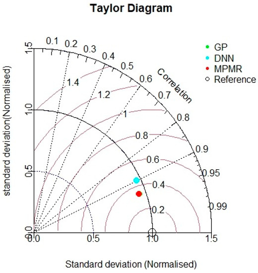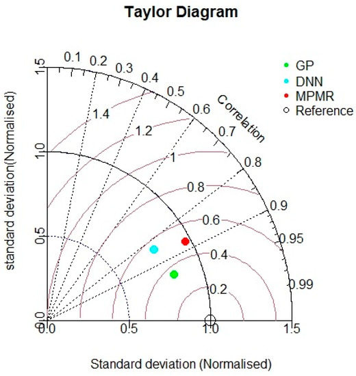 The above Table 4 depicts various respective tuning parameters for the adopted models to extract the best potential for the adopted dataset. The GP model has many regulators compared to the other MPMR and DNN models. The potency of the MPMR model depends on σ and ε. Similarly, the DNN model also has varied parameters. All the above-mentioned parameters were obtained by hit and trial approaches. The adopted machine learning models proclaimed their best optimized outcome from the above specified tuning variables. The potential of the developed models can be assessed using the correlation coefficient (R) value. The ideal value of R is unity, and it can be determined by using the following Equation (14).