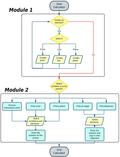 In said flowchart, both modules are clearly differentiated: in Module 1, the geometric elements (points, lines, and planes) are generated; in Module 2, the five types of geometric problems posed are solved (find the point of intersection, define a line or a plane, and determine angles and distances).